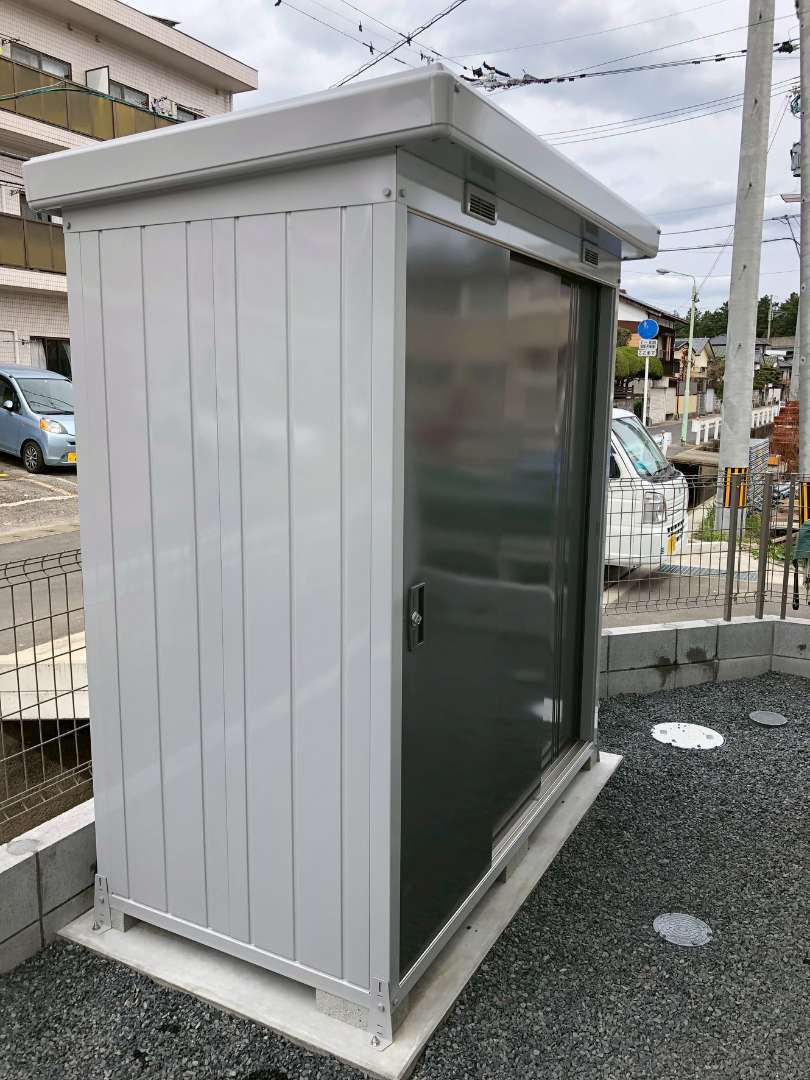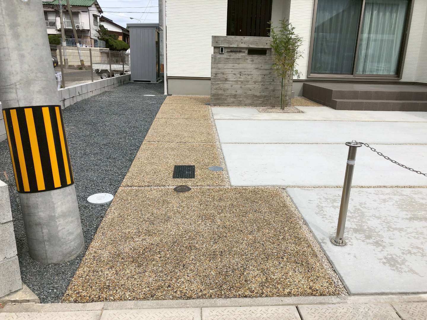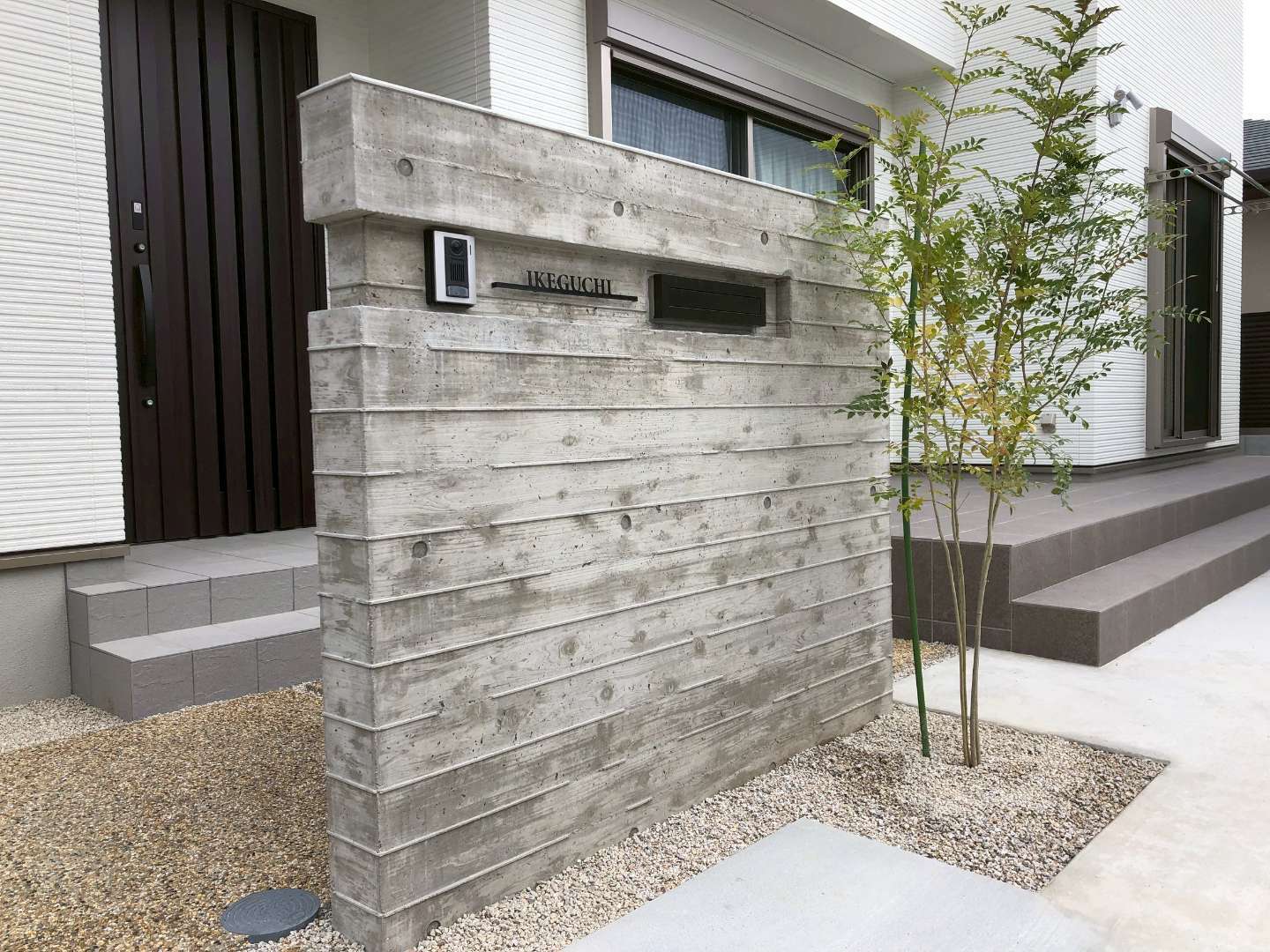 一番の見どころは、玄関前に重厚な存在感を放つ、無機質なコンクリートに天然木の木目を転写する高度な左官技術により、モダンでありながら温かみのある、高級感あふれる仕上がりとなりました。 アプローチには、明るい色味の「玉砂利洗い出し」を採用。コンクリートのグレーとのコントラストが美しく、雨の日でも滑りにくい、安全で意匠性の高い動線を実現しています。 さらに、愛車を守るワイドタイプのカーポートや、屋外収納に便利な物置も設置し、デザインと日々の使い勝手を高いレベルで両立させた外構が完成しました。