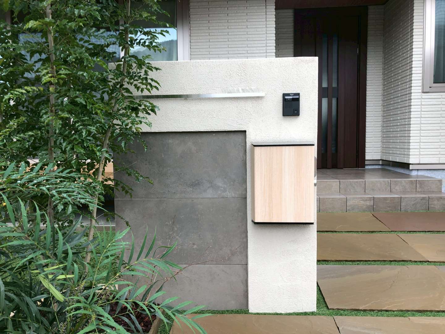 建物の顔となる門柱は、白の塗り壁にグレーのタイルをアクセントに加え、シンプルながらも重厚感のあるデザインに仕上げました。表札やポストもモダンなアイテムを選定し、植栽の緑が映えるエントランスとなっています。