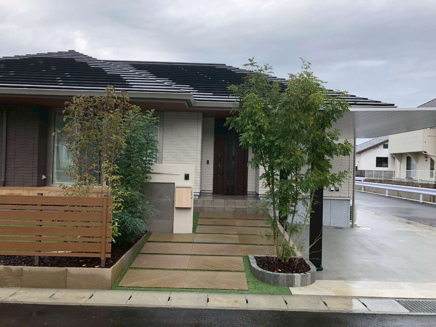 工事内容:新築外構一式(門柱造作、アプローチ敷設、駐車場土間コンクリート打設、カーポート設置、ウッドデッキ設置、目隠しフェンス設置、人工芝敷設、植栽工事)