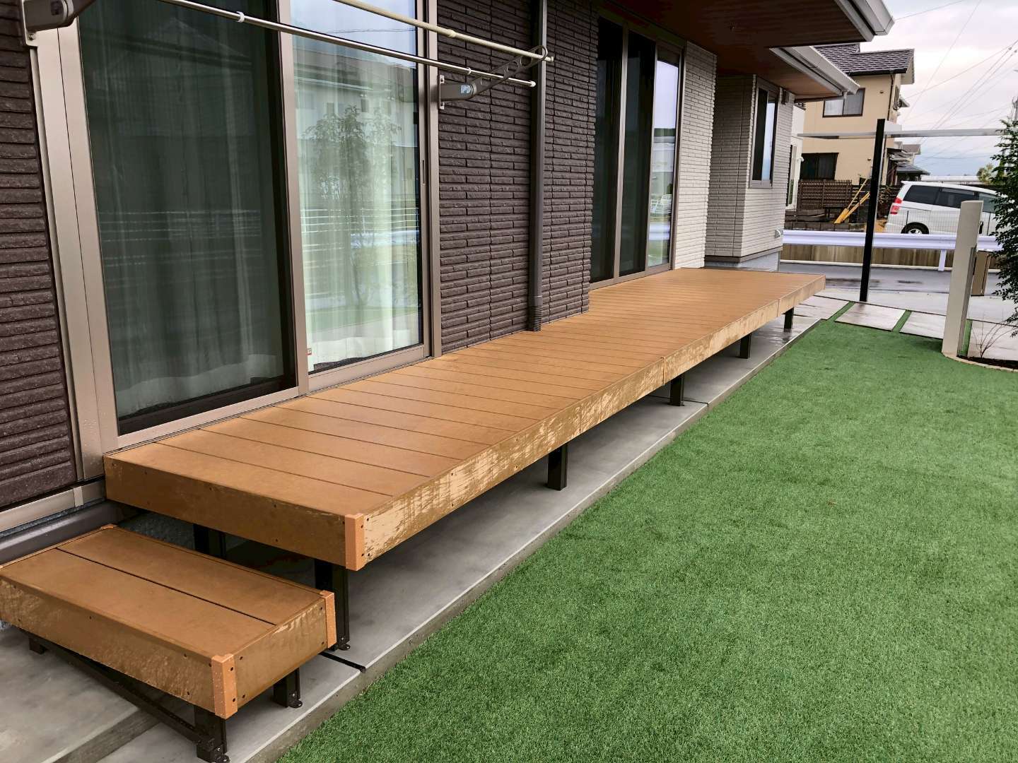 完成後、人工芝の緑と建物のコントラストが美しく、とても素敵な仕上がりになったと自負しております。 当初のお悩みであったメンテナンスの手間も大幅に軽減されていますので、これからはウッドデッキのあるお庭で、ご家族皆様での時間をゆっくりとお過ごしいただければ幸いです。