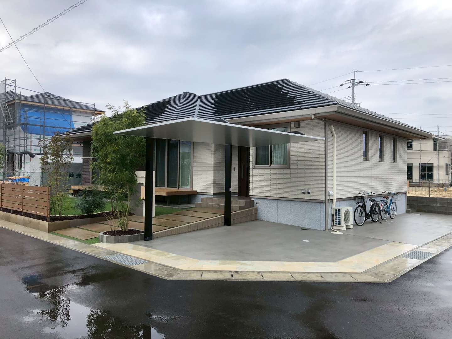 この度は新築外構工事をご用命いただき、誠にありがとうございました。 お住まいのこだわりの一つである「平屋」の魅力を最大限に引き立てるよう、カーポートの高さや門柱のバランスには特に配慮して設計いたしました。